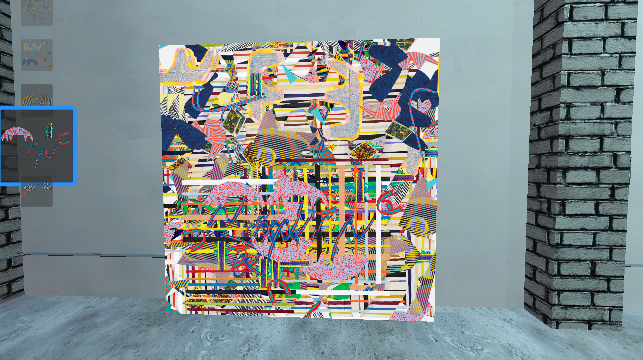 I was thrilled to get this to work. seeing my work abstracted into a video game like this is kind of mesmerizing. it is actually teaching me more about my own work than i thought i knew. The essence of my work in the studio is layering shapes and patterns to create interesting relationships between the positive and negative shapes between the layers.